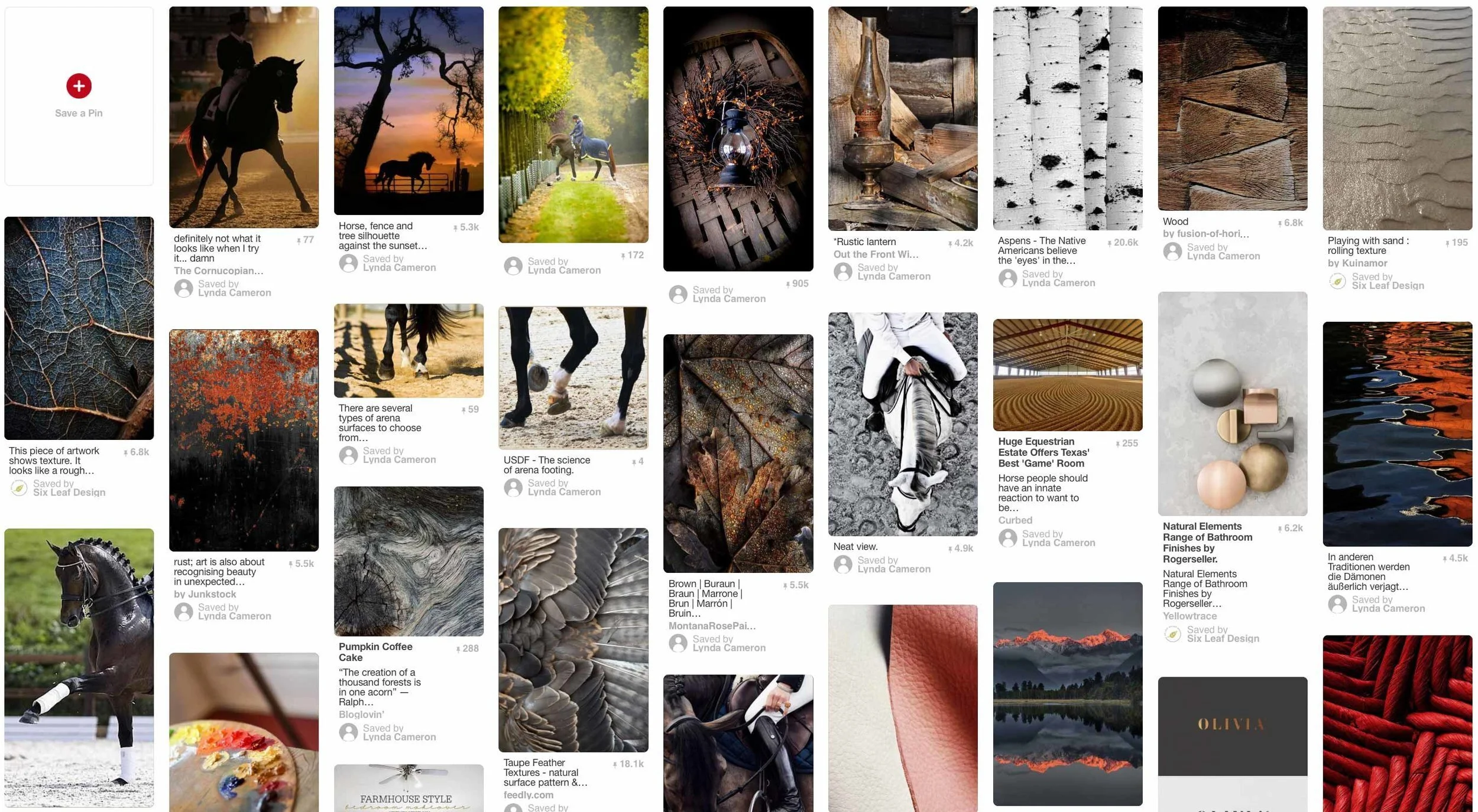 for the words like horse, stirrup, training arena and looked for images that felt very sophisticated and classic. In our board for Eagle’s Rise Ranch we started to see lots of dark, dramatic colors and pops of copper. So, I searched for more dramatic copper and black images. I also noticed lots of nature themed images, so we searched for more textured photos of leaves and patterns to reflect that and also matched the color + feeling that we had started to establish. After pinning loads of images and then touching base with the client, we decided to refine the board by deleting a few images that didn’t quite fit. Here is a shot of what our refined Pinterest board looked like in the end: