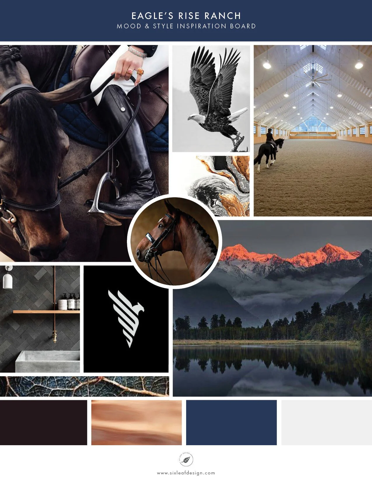 Eagle’s Rise Ranch is a horse ranch and Dressage training facility located in Snowmass, Colorado. During our consultation some of the adjectives that the client used to describe her business were quality, classic, hope, strength, and rustic. The client also told me a touching story about her family involving a plane crash and finding hope in the sun rising over the mountains, which is where the business name came from. So when we began searching for images on Pinterest we started by looking for a beautiful picture of the sunrise and mountains that had a very dramatic and hopeful feeling. I also looked for supporting detail images by searching
