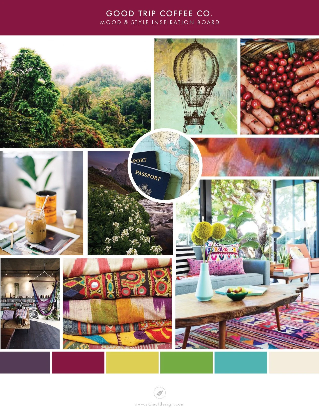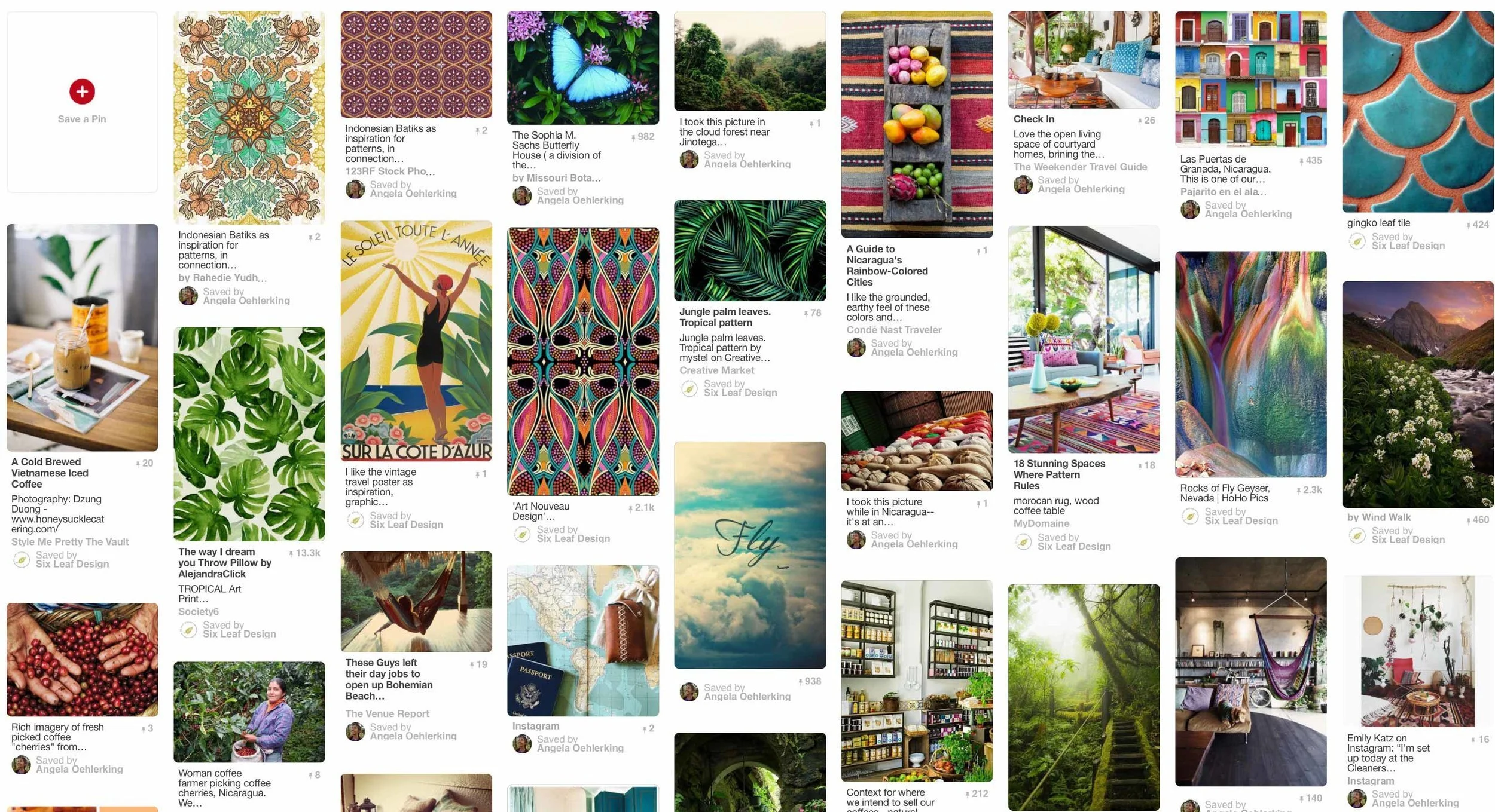 interesting patterns, so we wanted to incorporate those feelings into their mood board as well. We began by finding whimsical pictures of hot air balloons (which was the theme we decided on for their logo) and other travel related imagery. From there we explored photos of the Nicaraguan tree tops and cloud forest, hands sorting through coffee beans, exotic colors and art-deco feeling patterns. I noticed a slightly tropical feeling emerging, so I searched for more detailed photos of leaves and leaf patterns, and even looked for interior design images with the right whimsical feeing and colors. Here is a glimpse at our Pinterest board: