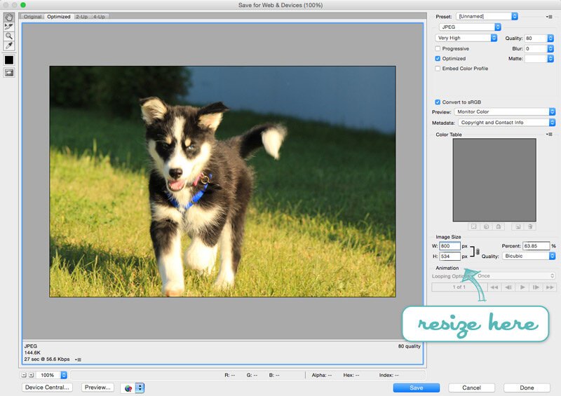 Now, I know that many people don’t use Photoshop on a regular basis, so if you don’t have it and still want to resize and optimize your photos, don’t worry! There are many other ways to resize and get your photos ready for web. If you’re on a Mac you can use the Preview app and select Tools > Adjust Size to resize your image. Or if you’re on a Windows computer you can easily use Paint to resize a photo by going to Resize in the home menu and entering the width that you want.
