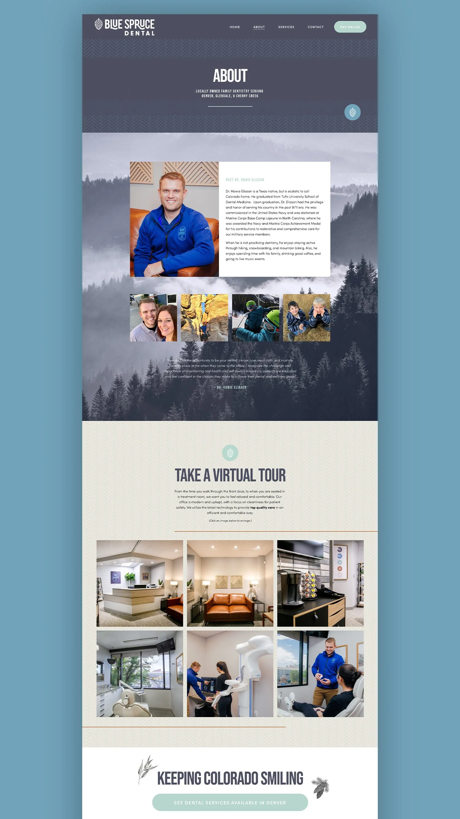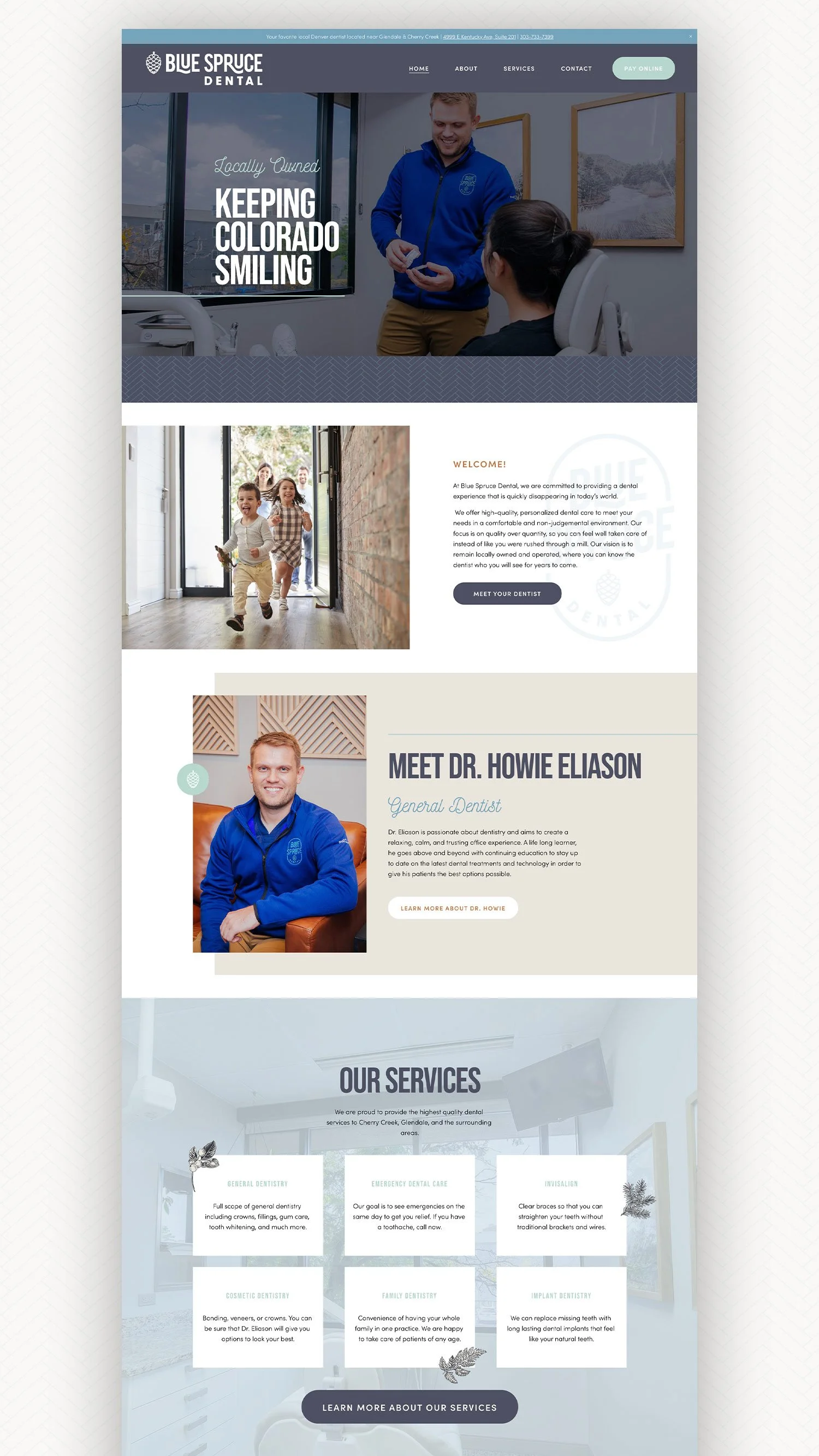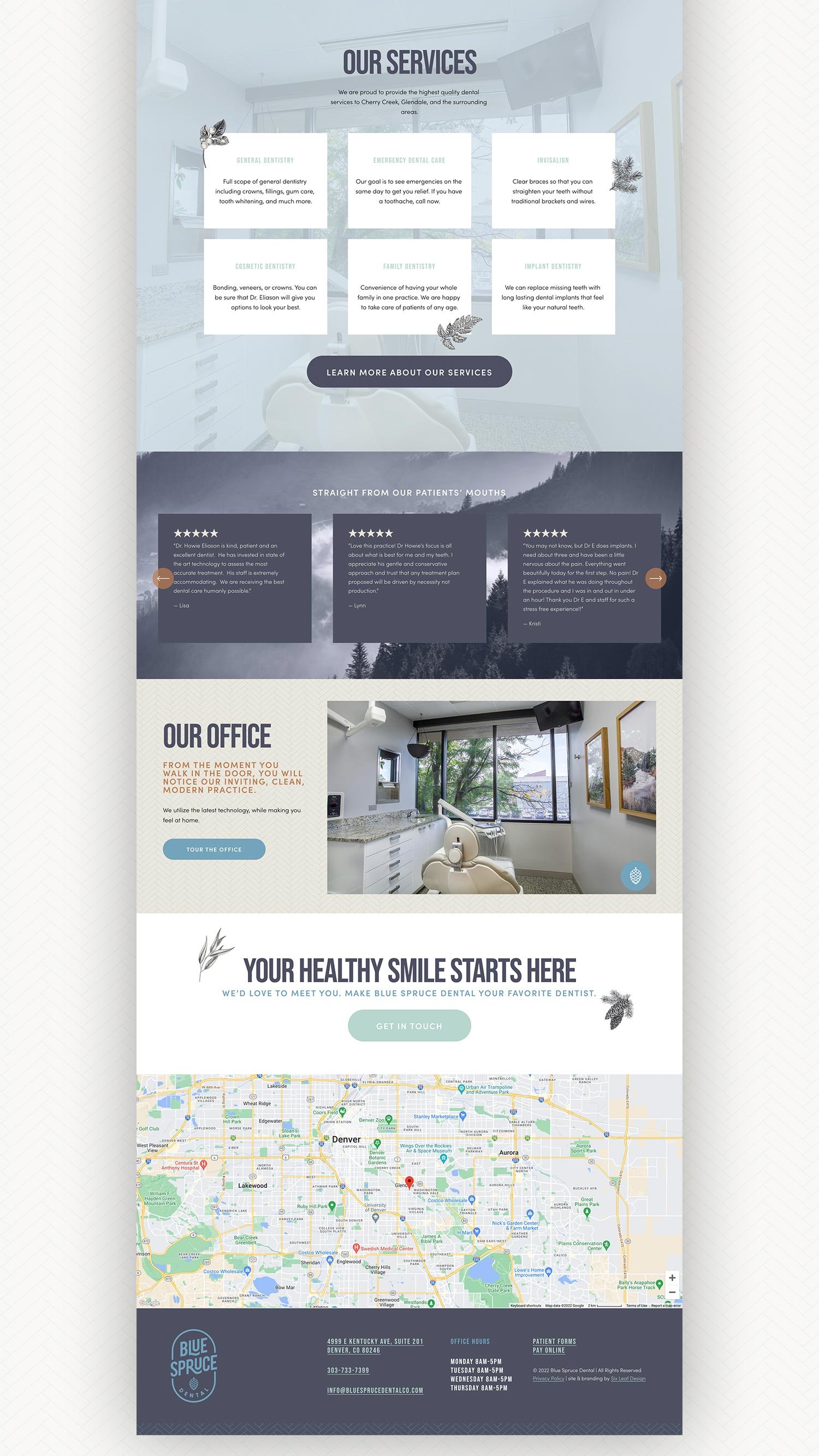 As a boutique dental practice with new ownership + a new name, Blue Spruce Dental didnโt want to feel like just another high-volume office pushing patients in and out the door. Our goal was to build a brand and website that reflected a more personal approach to dentistry rooted in trust, long term relationships, and genuinely easing dental anxiety. The challenge: create a cohesive, modern identity that felt clean, calming, and distinctly Colorado without falling into clichรฉ dental visuals โ then bring that ease and trustworthy experience through to the website.